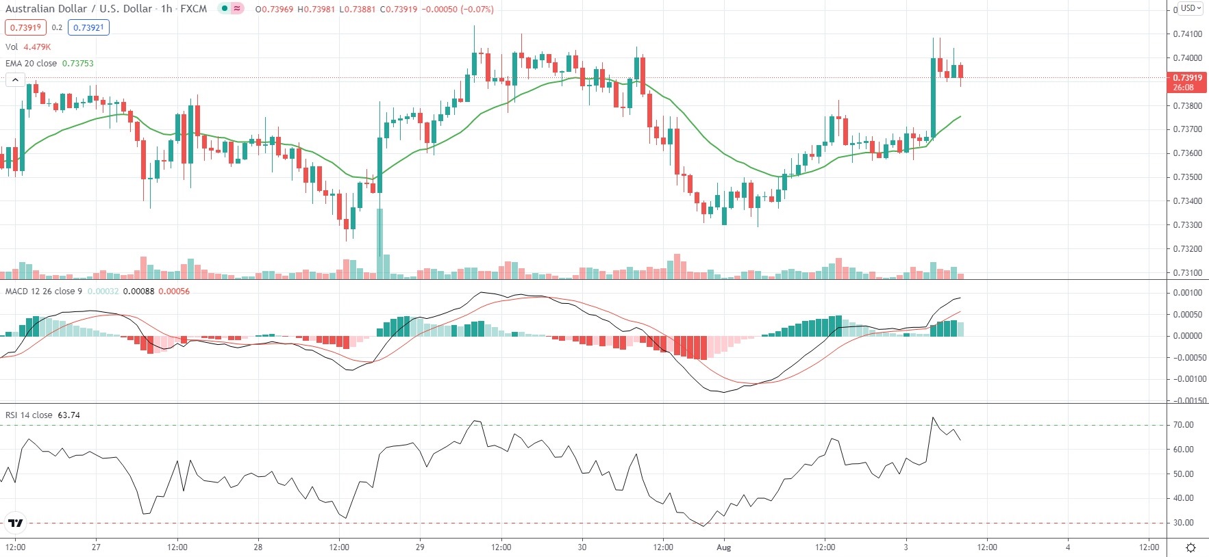 As of 8:25 GMT on Tuesday AUD/USD was edging up 0.45% to trade at 0.7391, while moving within a daily range of 0.7357-0.7408. The major currency pair has risen 0.65% so far in August, following a 2.07% drop in July.