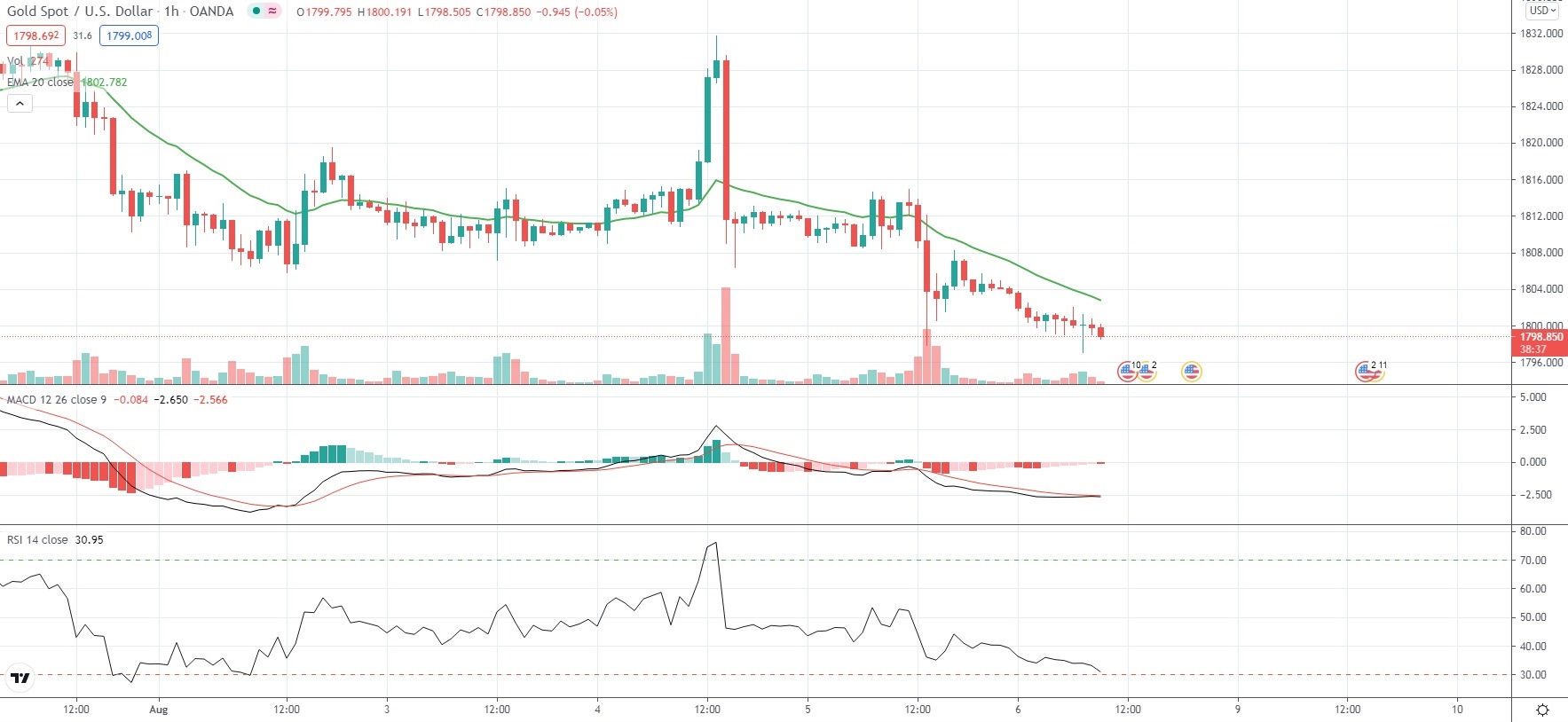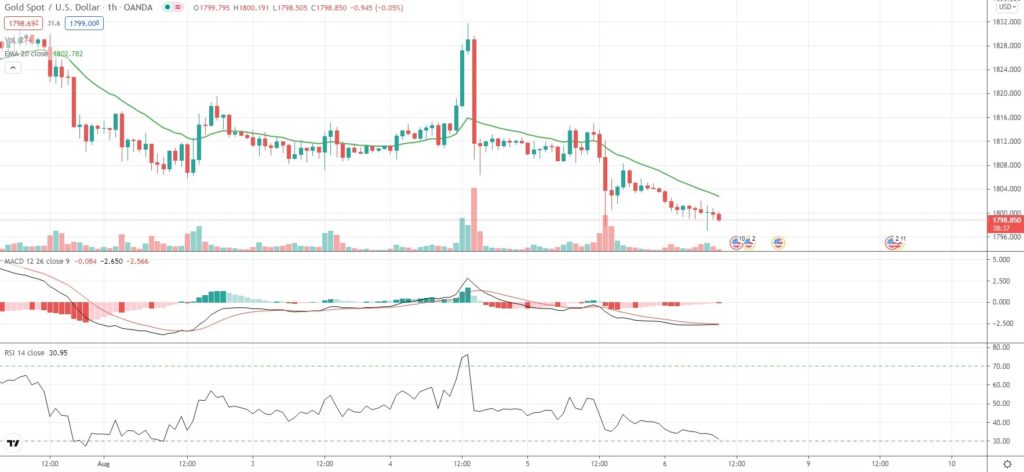 As of 9:20 GMT on Friday Spot Gold was edging down 0.31% to trade at $1,798.55 per troy ounce, after earlier touching an intraday low at $1,797.09 per troy ounce. The latter has been the metal’s weakest price level since July 28th ($1,792.79 per troy ounce).