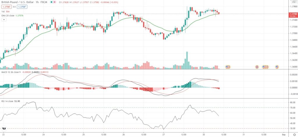 As of 9:03 GMT on Monday GBP/USD was inching up 0.02% to trade at 1.3760, while moving within a daily range of 1.3749-1.3775. Last week the Forex pair climbed as high as 1.3781, which has been its strongest level since August 18th (1.3786). The major currency pair has retreated 1.06% so far in August, following a 0.55% gain in July.