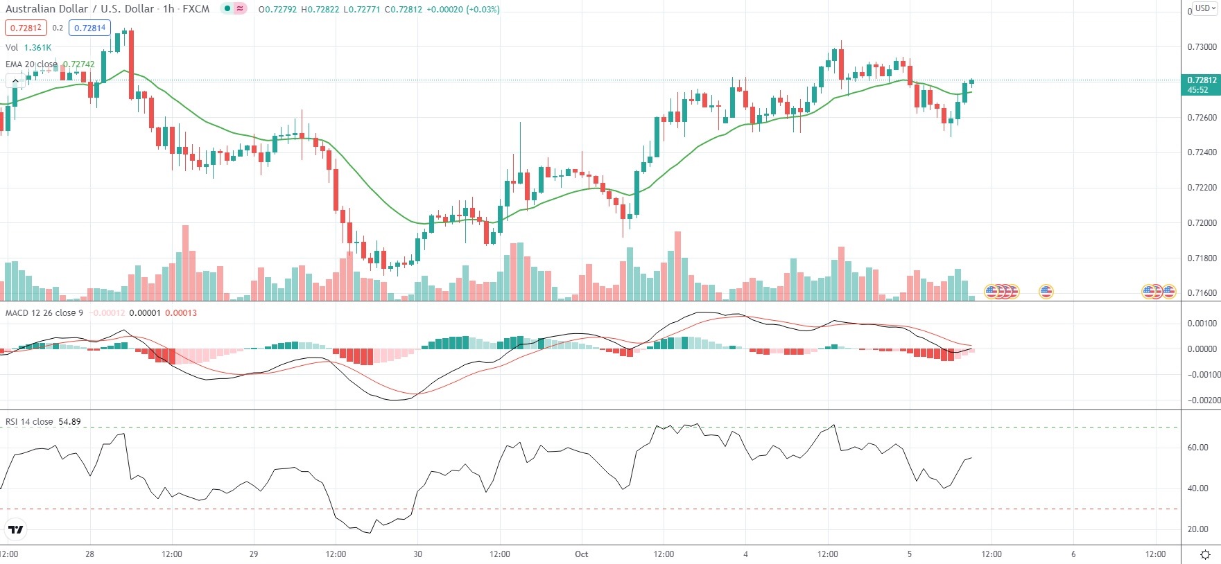 As of 8:54 GMT on Tuesday AUD/USD was inching down 0.07% to trade at 0.7278, while moving within a daily range of 0.7249-0.7294. Yesterday the Forex pair went up as high as 0.7304, which has been its strongest level since September 28th (0.7311). The major currency pair has gained 0.72% so far in October, following a 1.19% loss in September.