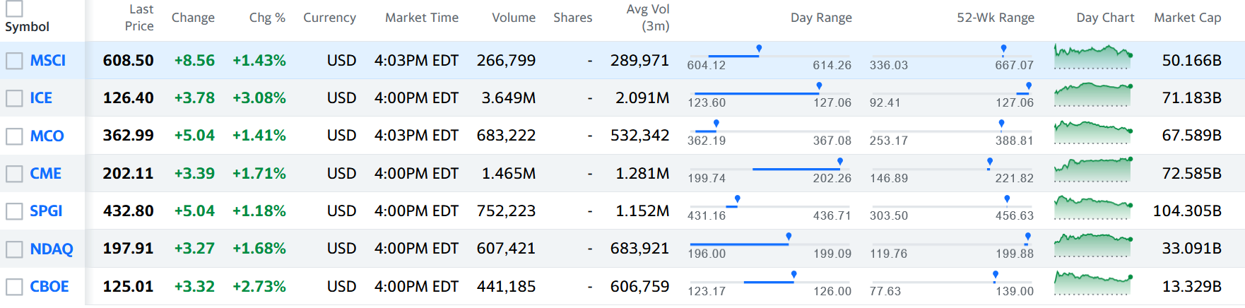 It is interesting to see huge gains of companies like the exchanges themselves /Bats, Nasdaq, ICE/, as well as ratings and benchmarks agencies, indices providers, etc. They largely outperformed the market.