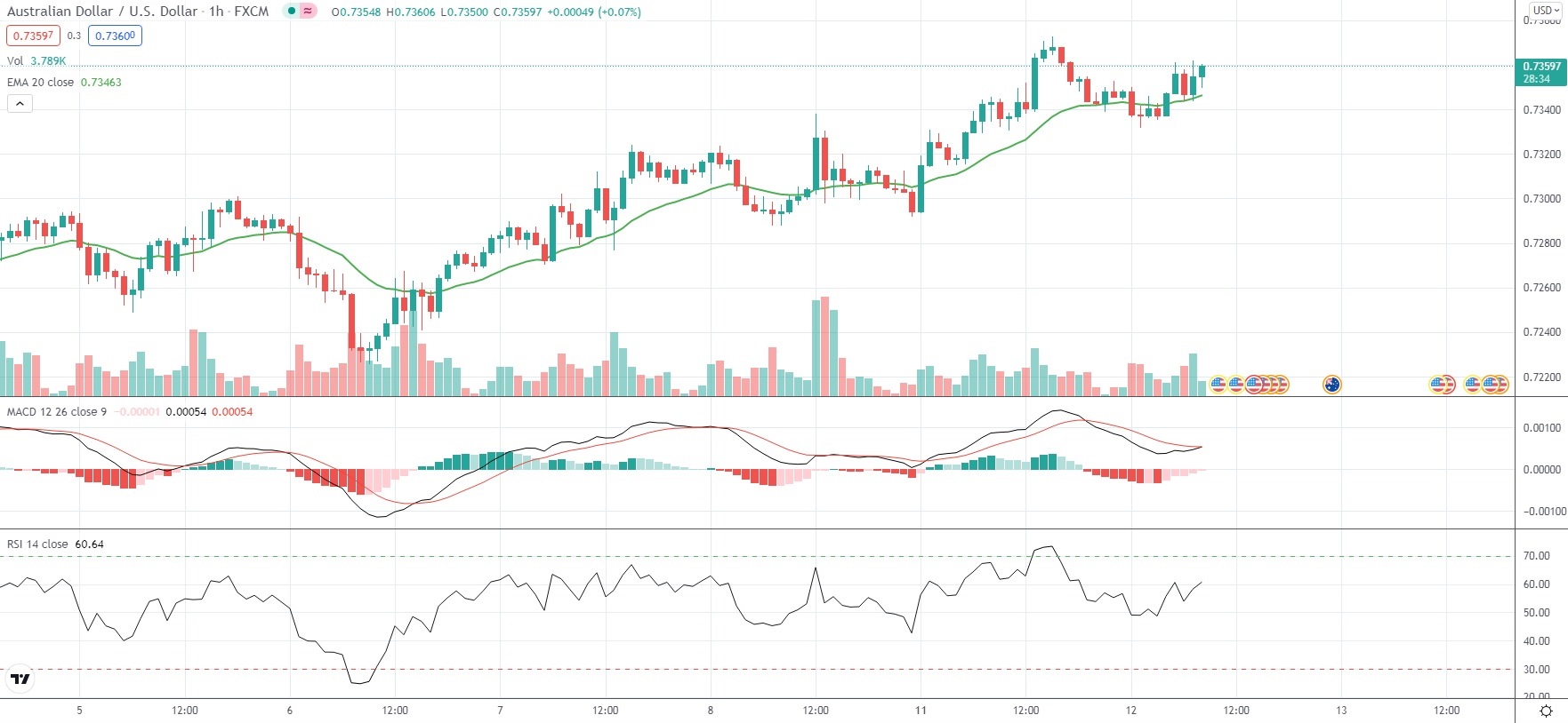 As of 8:30 GMT on Tuesday AUD/USD was edging up 0.22% to trade at 0.7359, while moving within a daily range of 0.7332-0.7362. Yesterday the Forex pair went up as high as 0.7373, which has been its strongest level since September 14th (0.7373). The major currency pair has gained 1.85% so far in October, following a 1.19% loss in September.