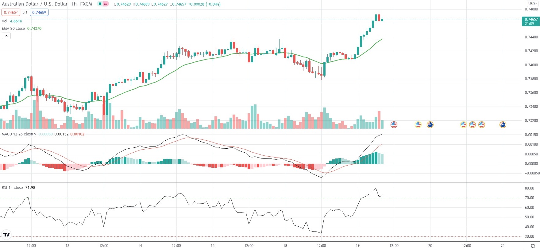 As of 8:32 GMT on Tuesday AUD/USD was gaining 0.79% to trade at 0.7467, after earlier touching an intraday high of 0.7476. The latter has been the Forex pair’s strongest level since September 3rd (0.7478). The major currency pair has gained 3.31% so far in October, following a 1.19% loss in September.