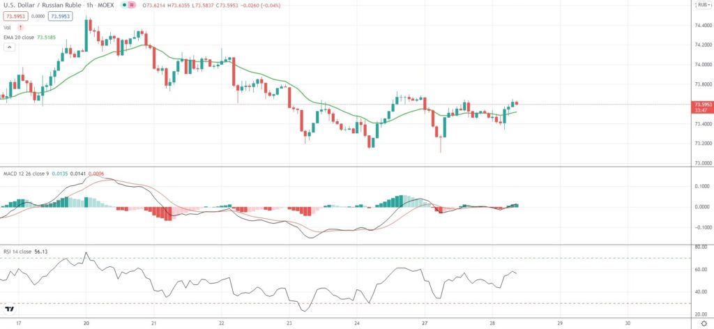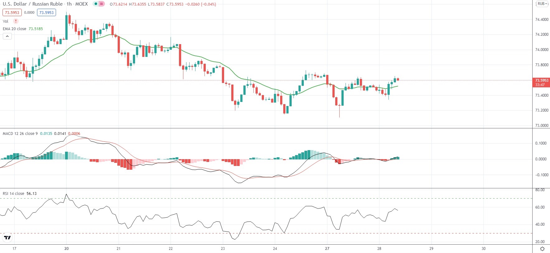 As of 10:09 GMT on Tuesday USD/RUB was edging up 0.23% to trade at 73.6312, while moving within a daily range of 73.3404-73.6504.
