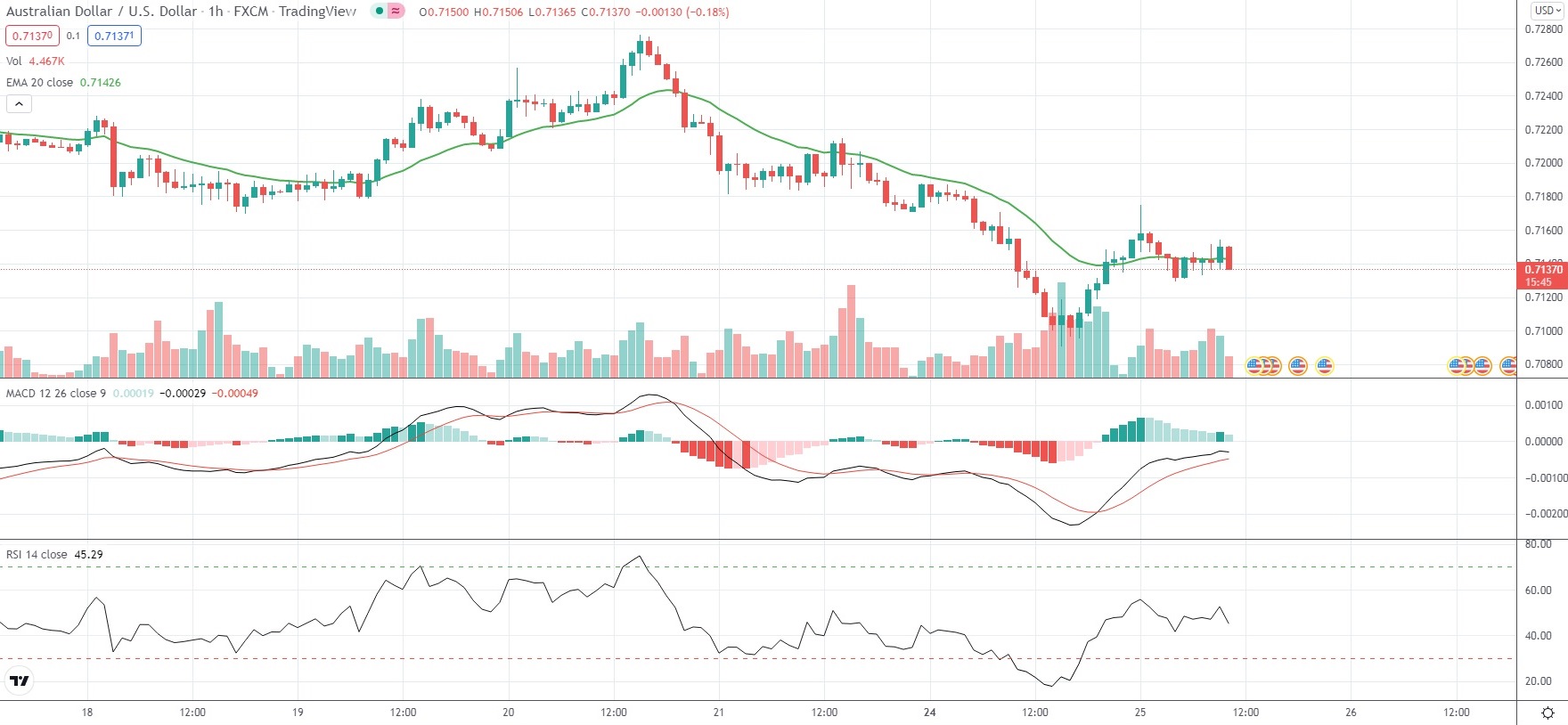 As of 10:39 GMT on Tuesday AUD/USD was inching down 0.05% to trade at 0.7139, while moving within a daily range of 0.7129-0.7178. Yesterday the major Forex pair slipped as low as 0.7091, which has been its weakest level since December 20th 2021 (0.7082).