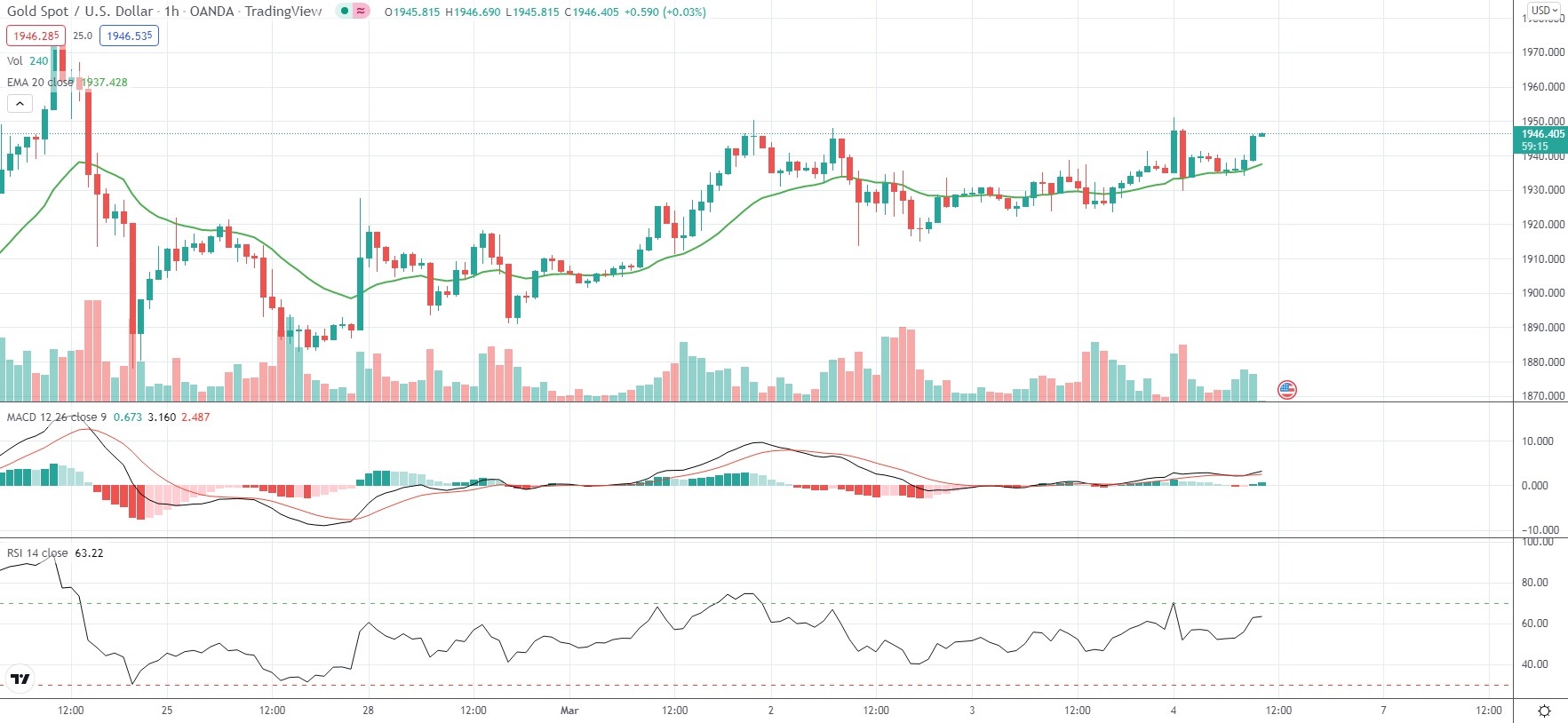 As of 9:47 GMT on Friday Spot Gold was edging up 0.41% to trade at $1,944.35 per troy ounce. Earlier in the trading session the yellow metal rose as high as $1,951.02 per troy ounce, which has been its strongest price level since February 24th ($1,974.48 per troy ounce).