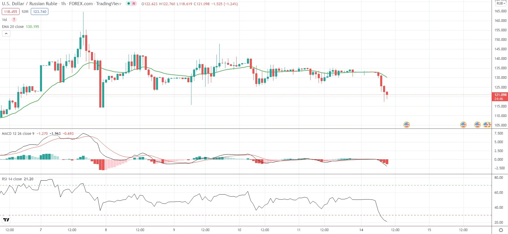 USD/RUB was 0.74% stronger to trade at 115.1000 in Moscow, while offshore, the currency pair was retreating 11.18% on Monday to 119.199. Last week the Russian currency plunged to a fresh all-time low of 150 against the US Dollar, but later stabilized after Russia’s central bank restricted access to foreign currency and the government rolled out initial support measures.