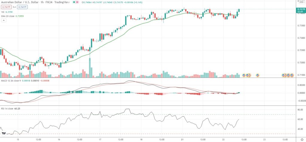 As of 9:53 GMT on Tuesday AUD/USD was edging up 0.21% to trade at 0.7415. Yesterday the major Forex pair climbed as high as 0.7425, which has been its strongest level since March 7th (0.7441).