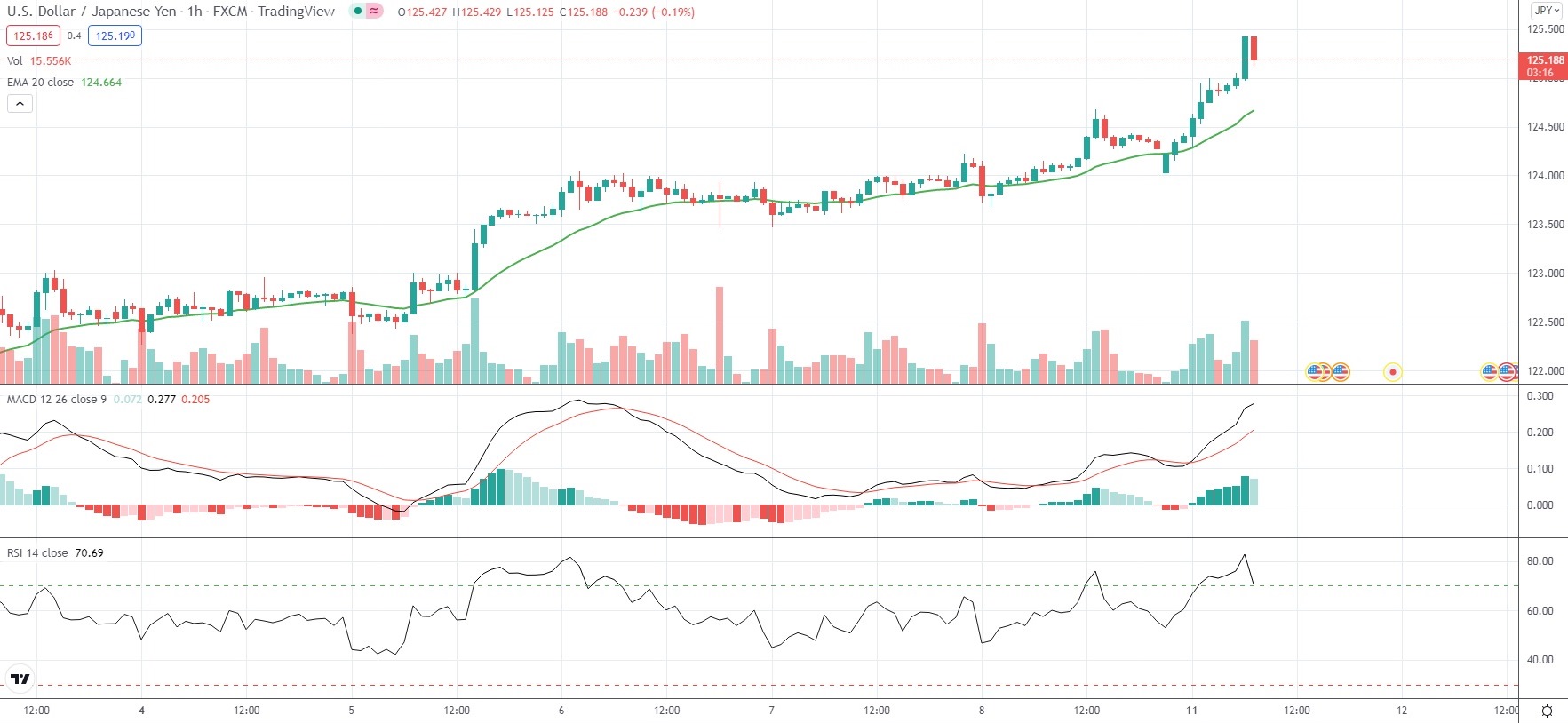 As of 7:55 GMT on Monday USD/JPY was gaining 0.74% to trade at 125.20. Earlier in the trading session the major Forex pair climbed as high as 125.44, which has been its strongest level since June 8th 2015 (125.68).