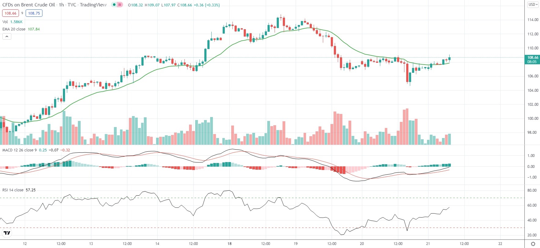 At the same time, Brent Oil Futures were advancing 1.35% on the day to trade at $108.72 per barrel. Yesterday the commodity went down as low as $104.71 per barrel, which has been its weakest price level since April 13th ($104.12 per barrel).