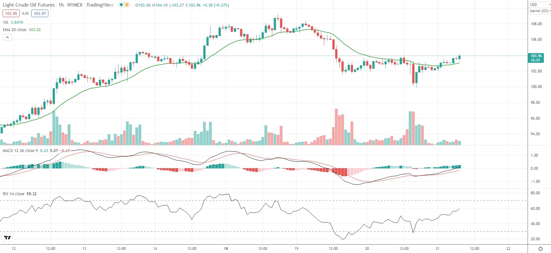 As of 7:40 GMT on Thursday WTI Crude Oil Futures were gaining 1.75% to trade at $103.98 per barrel. Yesterday the black liquid went down as low as $99.88 per barrel, which has been its weakest price level since April 13th ($99.87 per barrel).