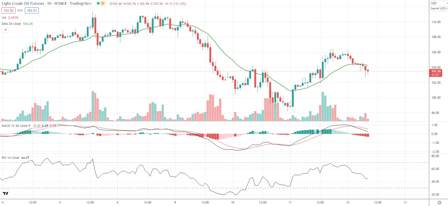 As of 8:27 GMT on Thursday WTI Crude Oil Futures were retreating 2.07% to trade at $103.52 per barrel. Yesterday the black liquid went down as low as $98.20 per barrel, which has been its weakest price level since April 26th ($97.06 per barrel).