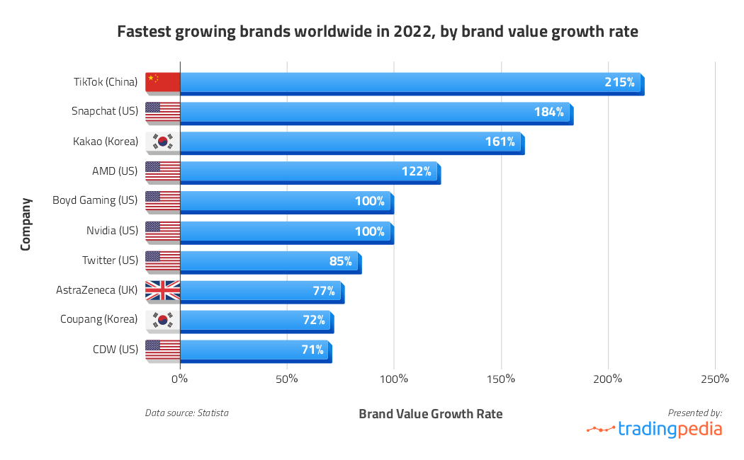 Globally, Snapchat ranks second among the fastest-growing brands, right after TikTok, which registered a brand value growth of 215% year-over-year, as reported in 2022.