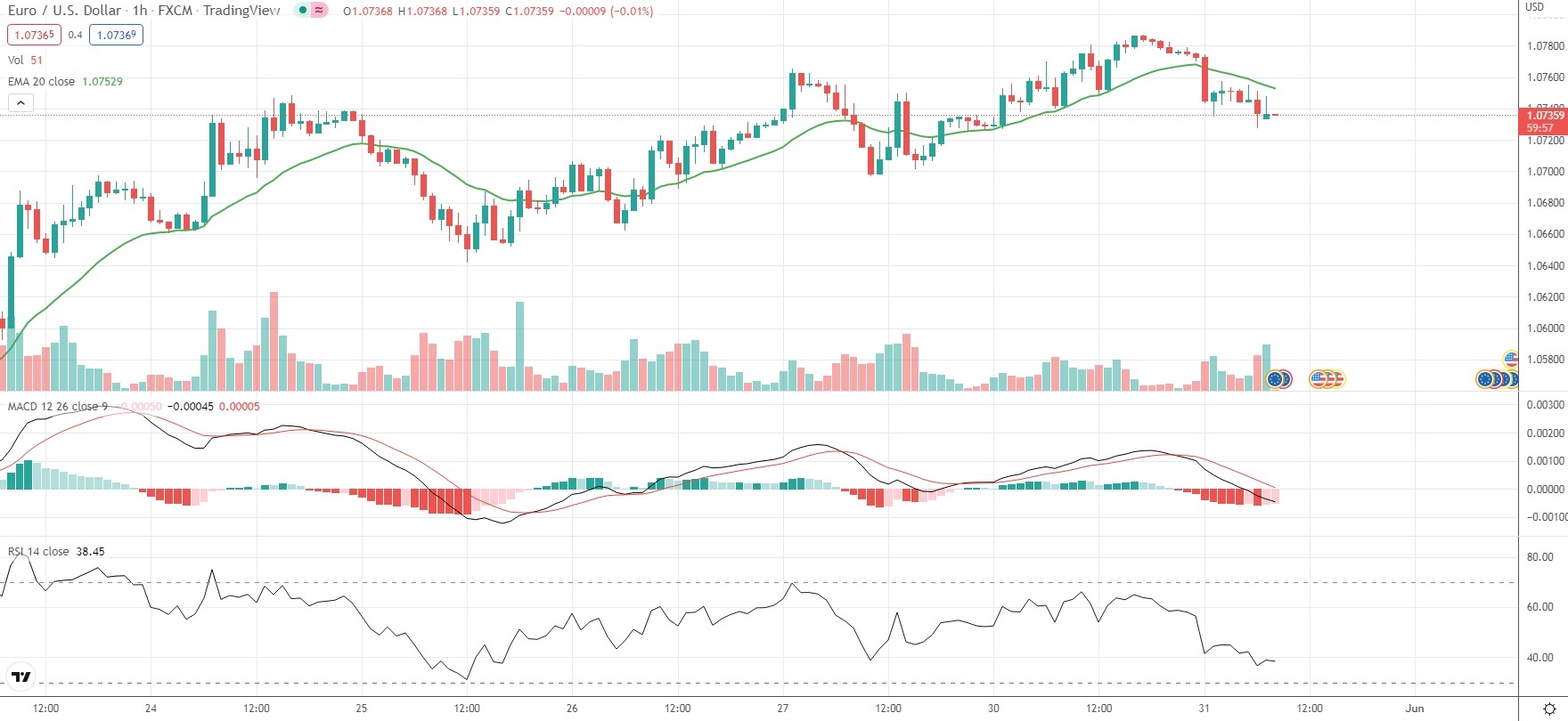 As of 7:54 GMT on Tuesday EUR/USD was edging down 0.35% to trade at 1.0737. Yesterday the major Forex pair climbed as high as 1.0787, which has been its strongest level since April 25th (1.0815).