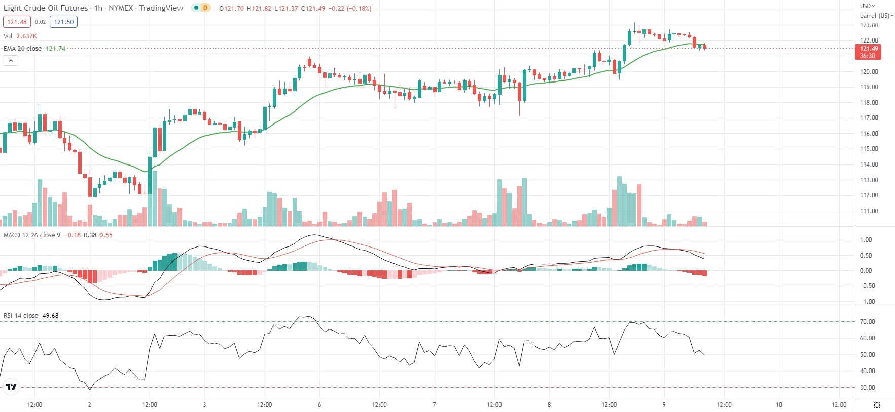 As of 8:32 GMT on Thursday WTI Crude Oil Futures were retreating 0.47% to trade at $121.53 per barrel. Earlier this week the black liquid went up as high as $123.18 per barrel, which has been its strongest price level since March 9th ($126.84 per barrel).