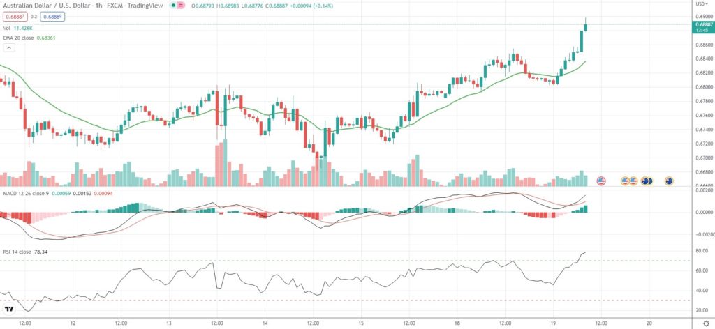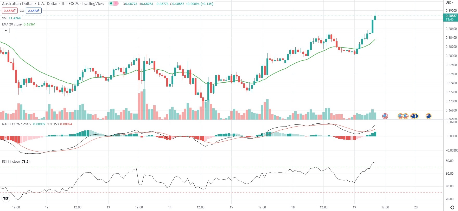 As of 8:45 GMT on Tuesday AUD/USD was gaining 1.12% to trade at 0.6888. Last week the major Forex pair went down as low as 0.6681, which has been its weakest level since June 1st 2020 (0.6648).