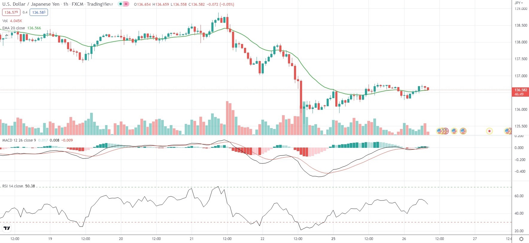As of 8:12 GMT on Tuesday USD/JPY was inching down 0.04% to trade at 136.580. Last week the major Forex pair slipped as low as 135.569, which has been its weakest level since July 8th (135.323).