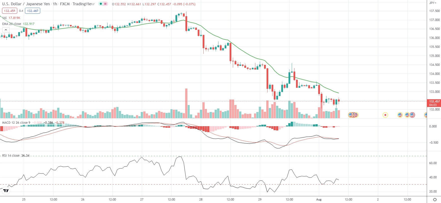 As of 8:54 GMT on Monday USD/JPY was losing 0.56% to trade at 132.455. During the early phase of today’s Asian session the major Forex pair slipped as low as 132.055, which has been its weakest level since June 16th (131.491).