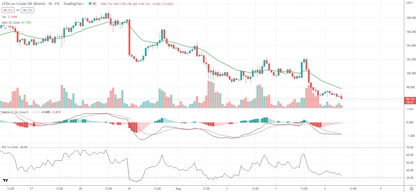 At the same time, Brent Oil Futures were losing 0.83% on the day to trade at $96.31 per barrel. Earlier in the trading session Brent Oil went down as low as $96.23 per barrel, which has been its weakest price level since July 14th ($94.48 per barrel).