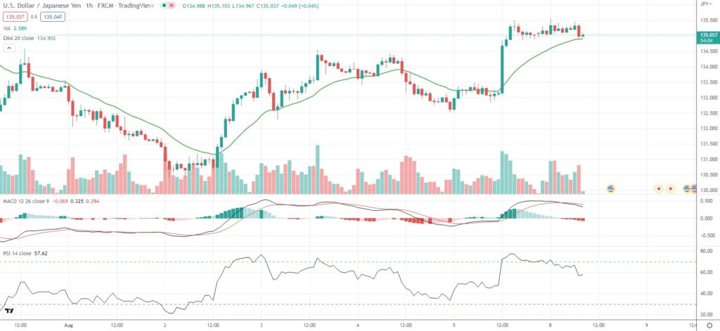 As of 8:04 GMT on Monday USD/JPY was inching up 0.03% to trade at 135.065. During the early phase of today’s Asian session the major Forex pair climbed as high as 135.583, which has been its strongest level since July 28th (136.579).