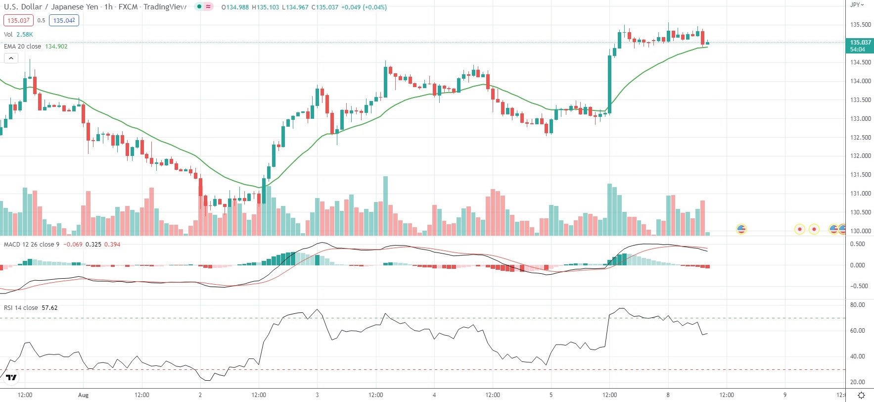 USD/JPY has risen 1.35% so far in August, following a 1.81% drop in July.