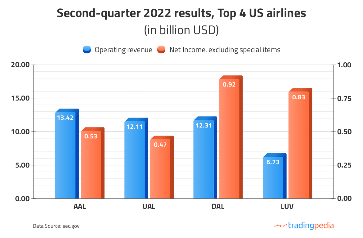 TradingPedia‘s editorial team decided to analyse the financial performance of the 4 major US airlines in the second quarter of 2022 – American Airlines (AAL), United Airlines (UAL), Delta Air Lines (DAL) and Southwest Airlines (LUV). The information gathered through our analysis allows to draw a conclusion about the overall development of the domestic airlines industry in the U.S.