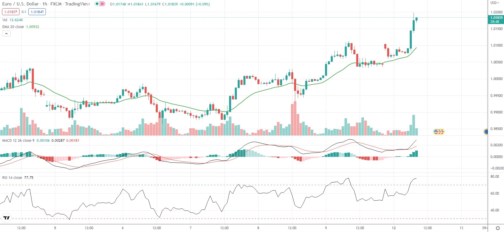 As of 8:30 GMT on Monday EUR/USD was gaining 1.39% to trade at 1.0183. During early European trading session, the major Forex pair climbed as high as 1.0198, which has been its strongest level since August 17th (1.0203).