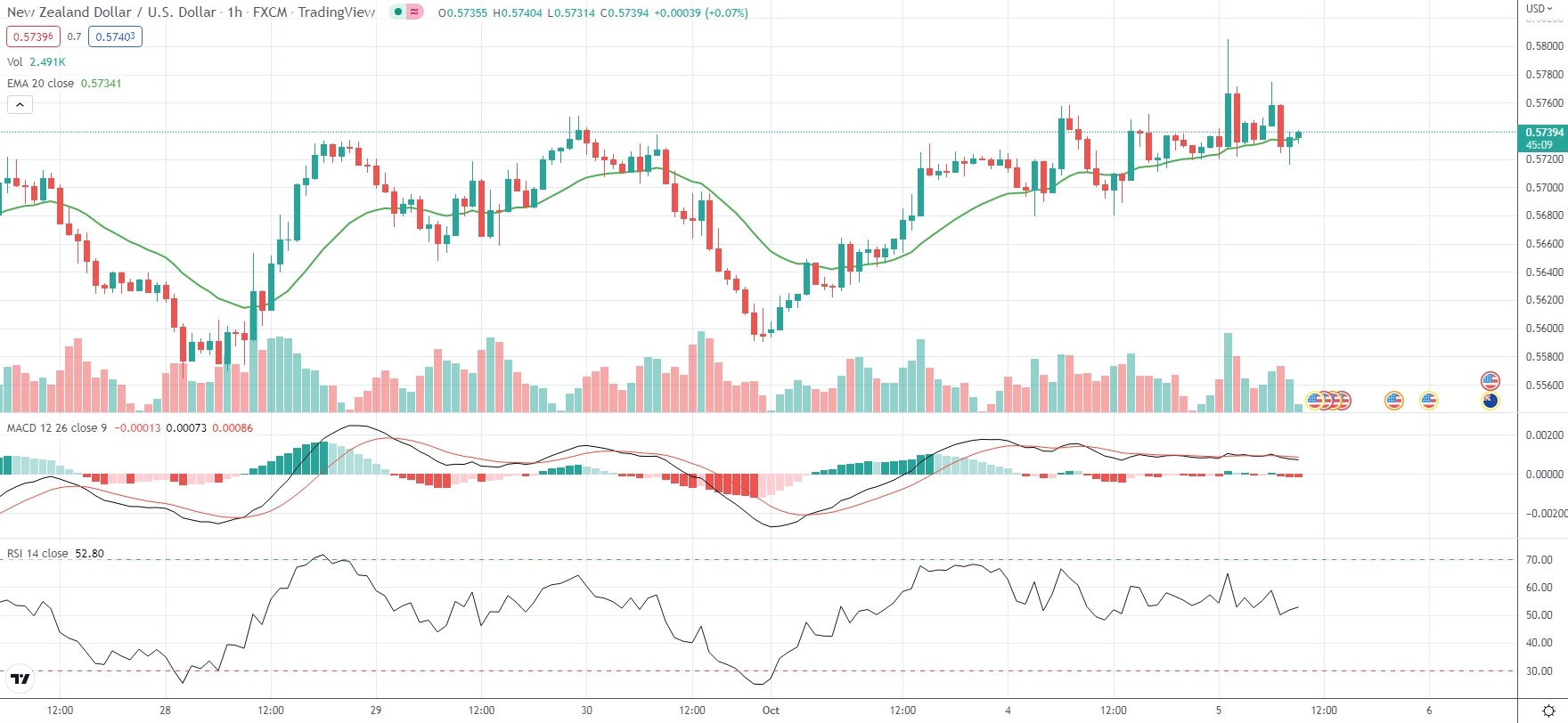 As of 9:14 GMT on Wednesday NZD/USD was edging up 0.16% to trade at 0.5739. Earlier today, the major Forex pair went up as high as 0.5805, which has been its strongest level since September 23rd (0.5856).