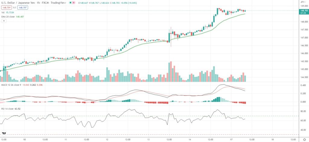 As of 8:52 GMT on Monday USD/JPY was inching down 0.02% to trade at 148.703. Last week, the major Forex pair climbed as high as 148.86, which has been its strongest level since August 1990.