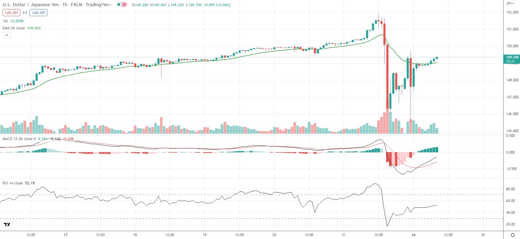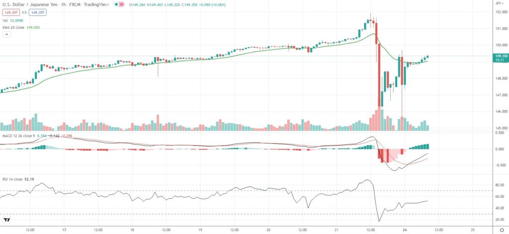 The USD/JPY pair reached an intraday high at 149.70 during the early phase of the Asian trading session, after which it plunged to 145.28 in a matter of minutes, an occurrence that suggested the Bank of Japan, acting for Japan’s Ministry of Finance, had intervened for a second consecutive day.