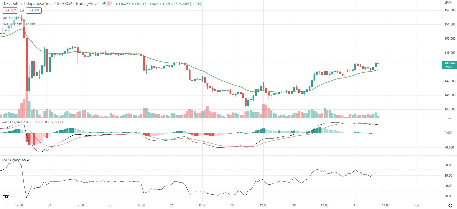 As of 9:20 GMT on Monday USD/JPY was gaining 0.55% to trade at 148.25. Last week, the major Forex pair slipped as low as 145.10, which has been its weakest level since October 7th (144.63).