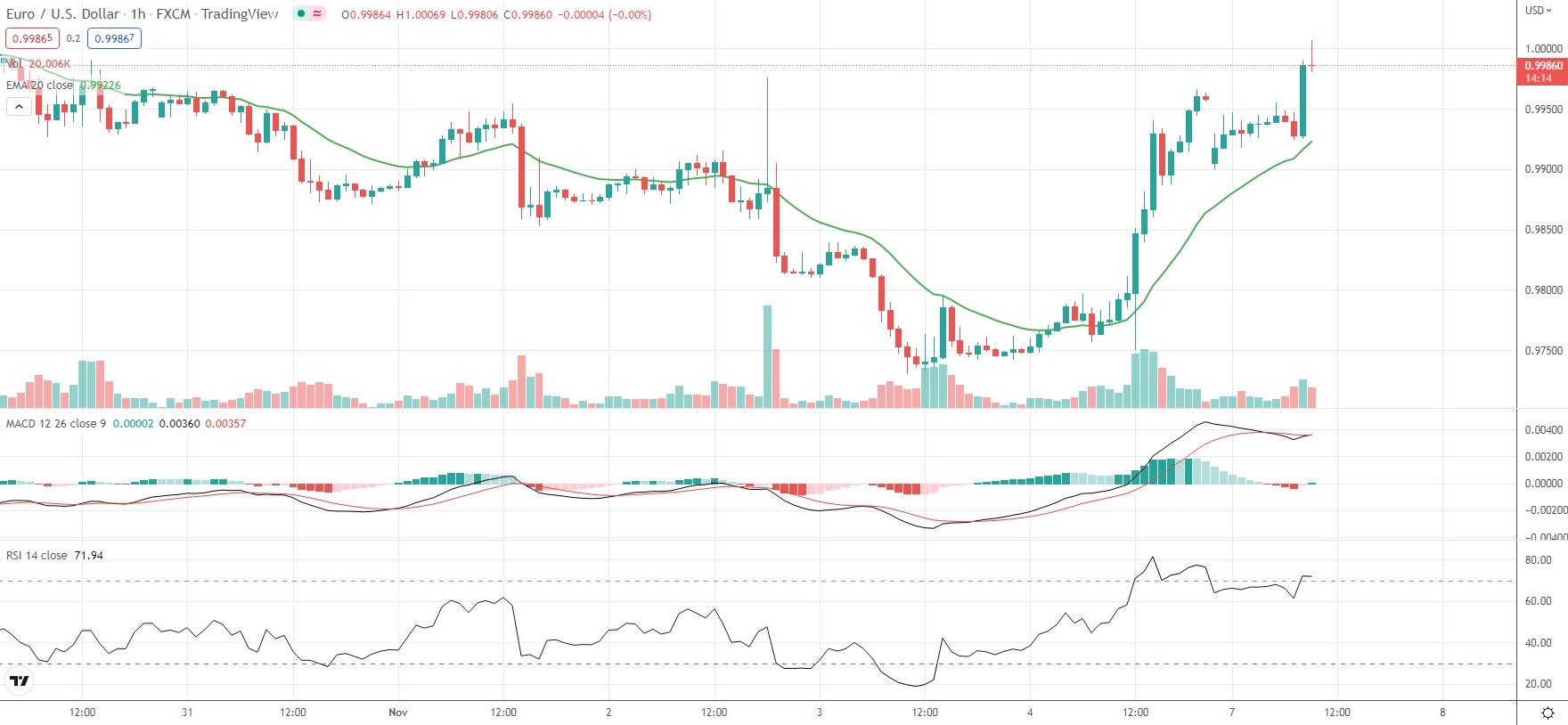 As of 9:44 GMT on Monday EUR/USD was edging up 0.30% to trade at 0.9988. Last week, the major Forex pair went down as low as 0.9730, which has been its weakest level since October 21st (0.9705).