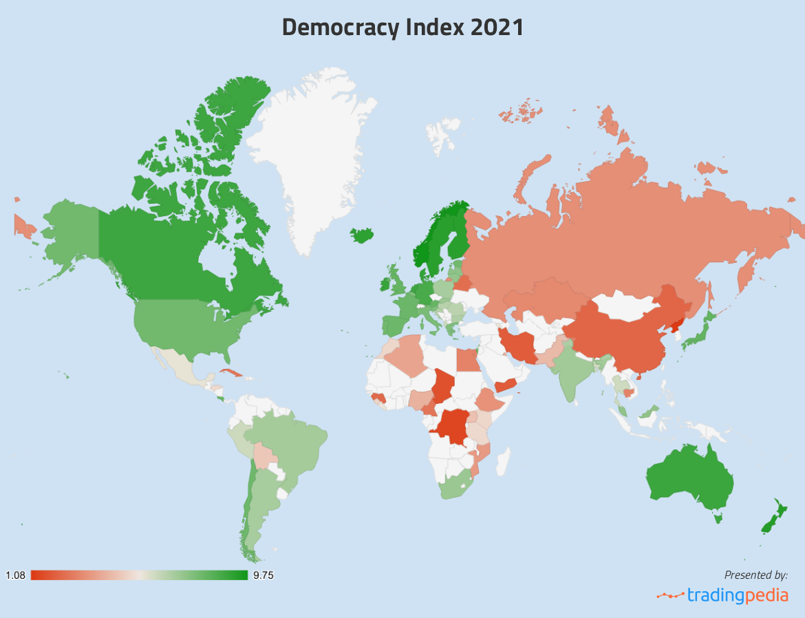 For this report, we looked at 79 countries around the world and their electoral systems. The Democracy Index we added is the latest published Index by the EIU for 2021.
