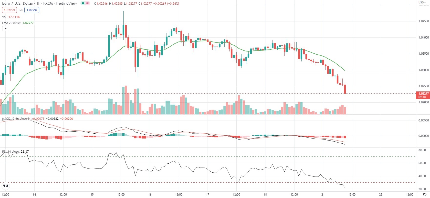 As of 9:49 GMT on Monday EUR/USD was losing 0.88% to trade at 1.0232. Earlier in the European trading session, the major Forex pair slipped as low as 1.0226, which has been its weakest level since November 11th (1.0163).
