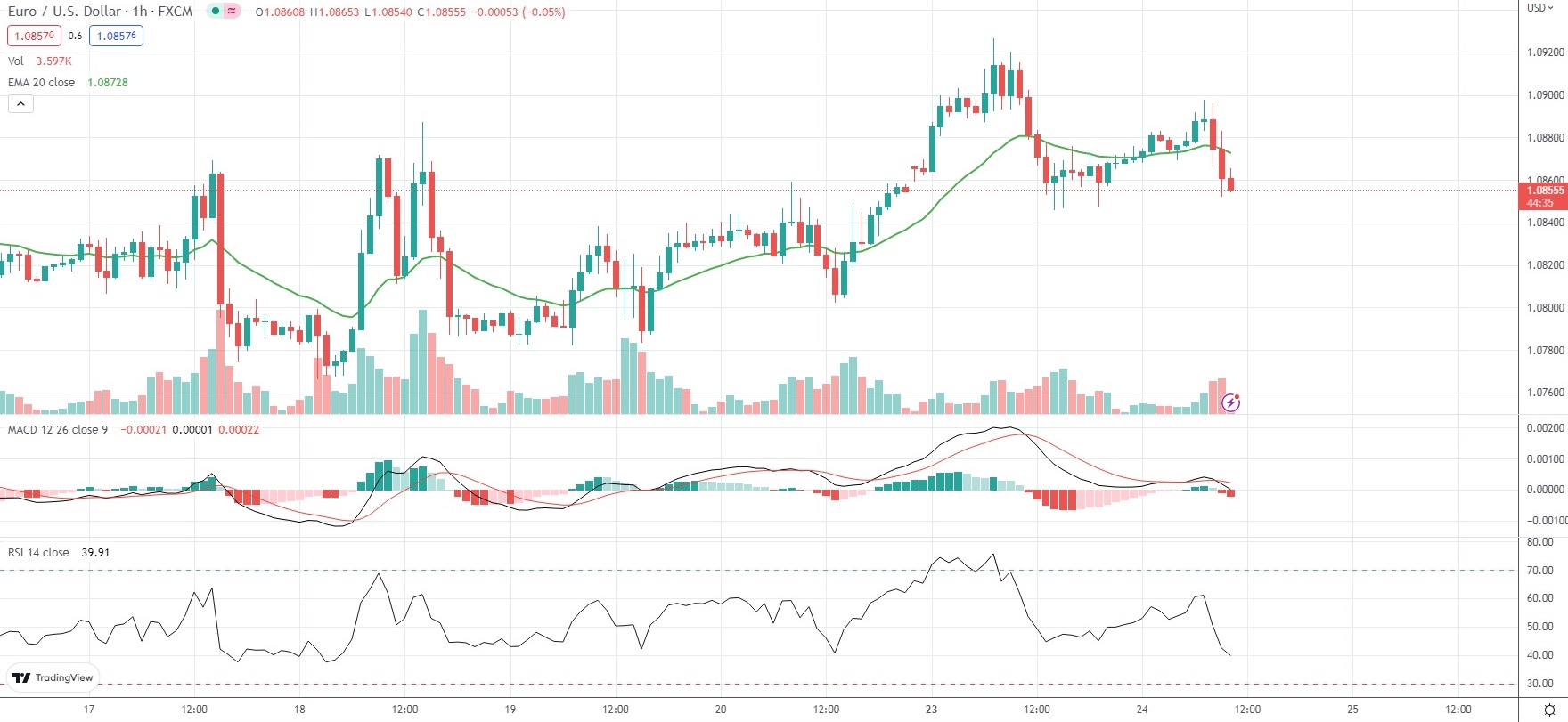 As of 10:14 GMT on Tuesday EUR/USD was edging down 0.10% to trade at 1.0857, while moving within a tight daily range. Yesterday the major Forex pair went up as high as 1.0927, which has been its strongest level since April 21st 2022 (1.0936).