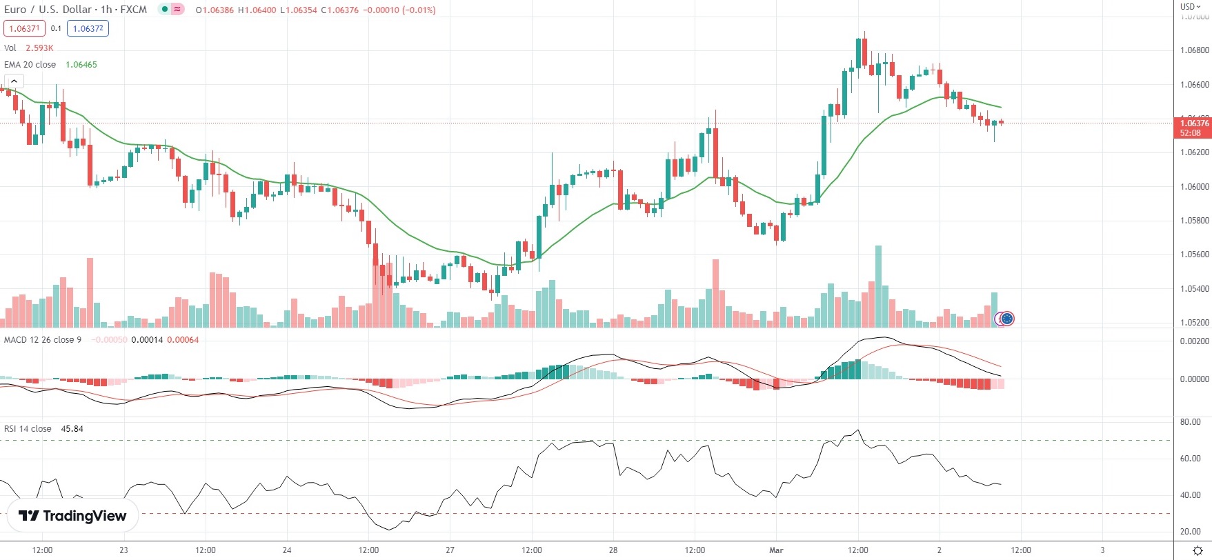 As of 9:07 GMT on Thursday EUR/USD was edging down 0.28% to trade at 1.0636. Yesterday the major Forex pair registered its sharpest advance since February 1st, climbing as high as 1.0691. The latter has been the pair’s strongest level since February 21st (1.0698).