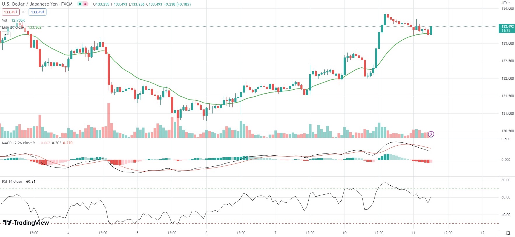 As of 6:48 GMT on Tuesday USD/JPY was inching down 0.08% to trade at 133.486. Yesterday the major Forex pair went up as high as 133.870, which has been its strongest level since March 15th (135.112).