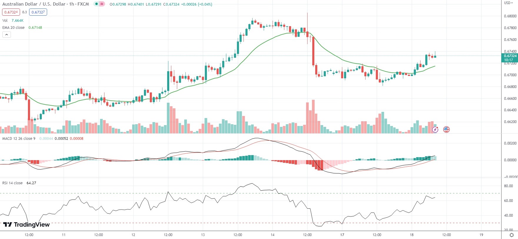 As of 8:49 GMT on Tuesday AUD/USD was gaining 0.51% to trade at 0.6734.
