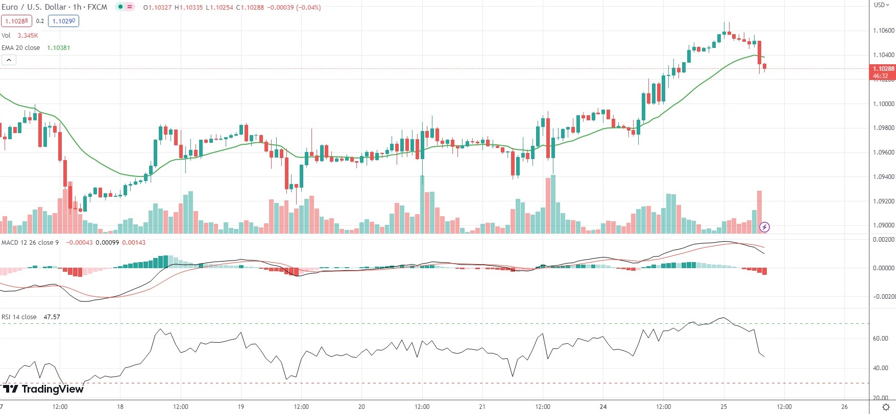 As of 8:12 GMT on Tuesday EUR/USD was edging down 0.14% to trade at 1.1030. During the early phase of the Asian trading session, the major Forex pair went up as high as 1.1067. The latter has been the pair’s strongest level since April 14th (1.1076).