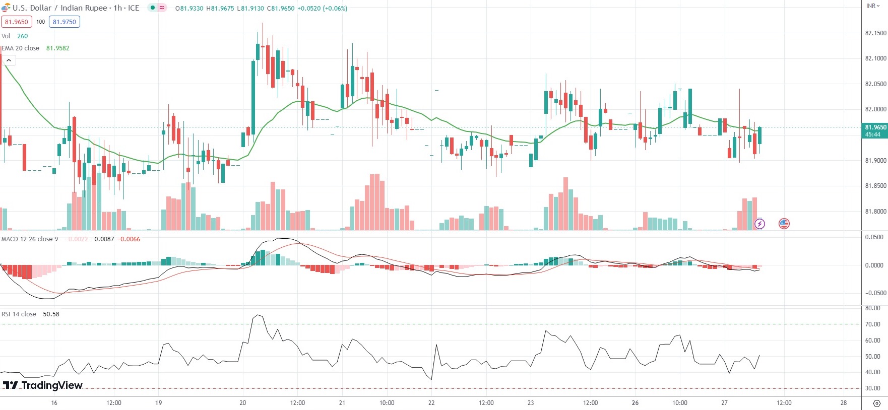 As of 7:14 GMT on Tuesday USD/INR was inching down 0.08% to trade at 81.9190. The exotic Forex pair has found solid support within the area between 81.8500 and 81.9300 over the past ten trading days.