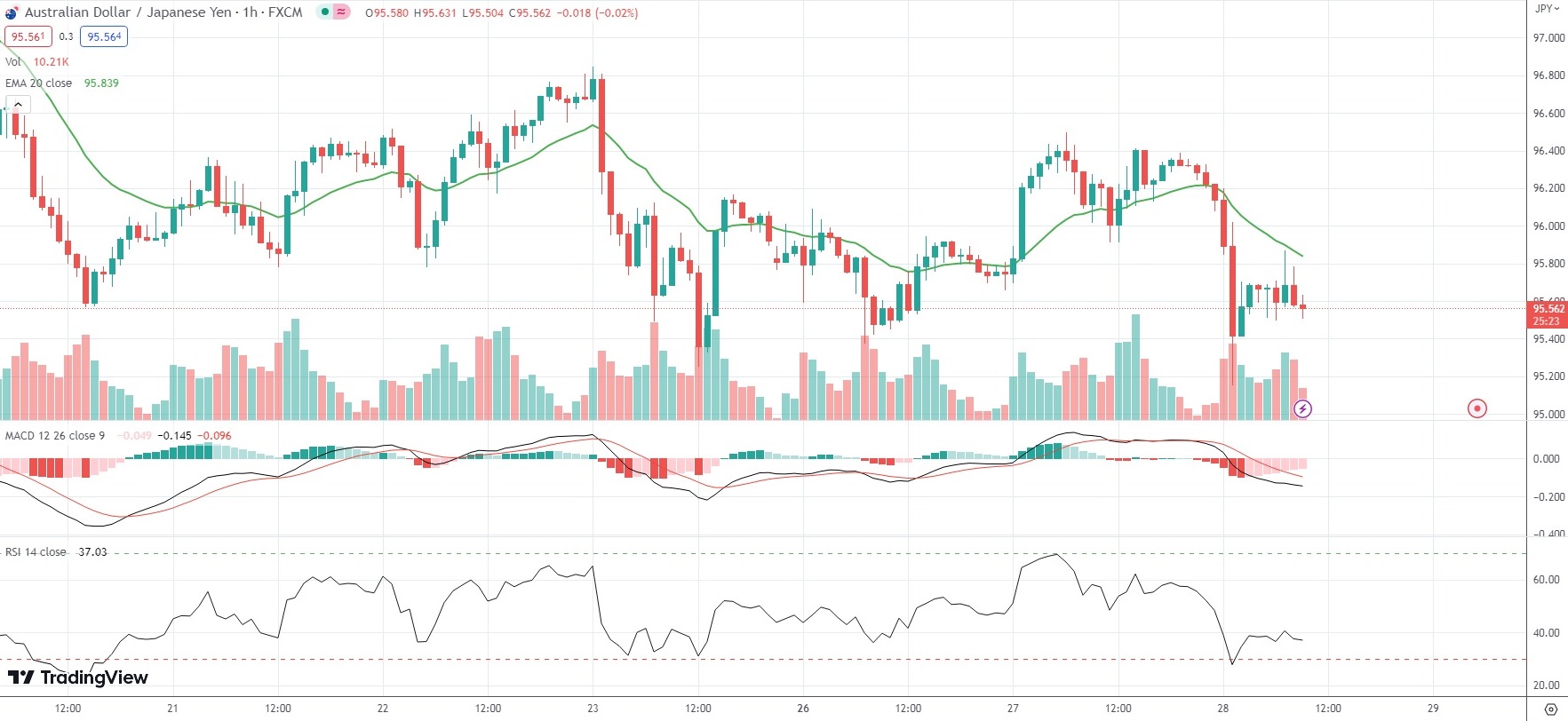 As of 9:34 GMT on Wednesday AUD/JPY was losing 0.80% to trade at 95.554. During the early phase of the Asian trading session, the minor Forex pair went down as low as 95.152. The latter has been the pair’s weakest level since June 15th (95.088).