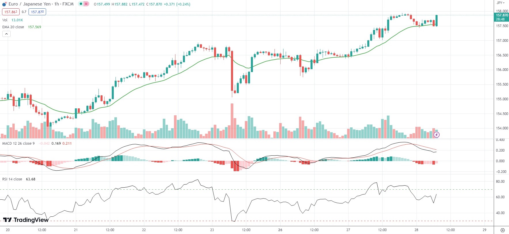As of 7:29 GMT on Wednesday EUR/JPY was inching down 0.07% to trade at 157.774. Yesterday the minor Forex pair went up as high as 157.937. The latter has been the pair’s strongest level since September 3rd 2008 (158.033).