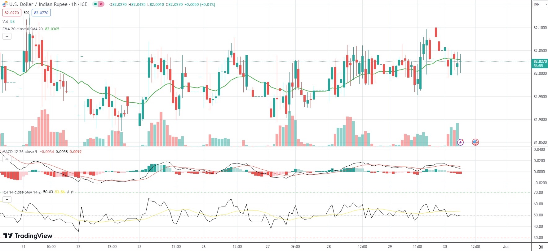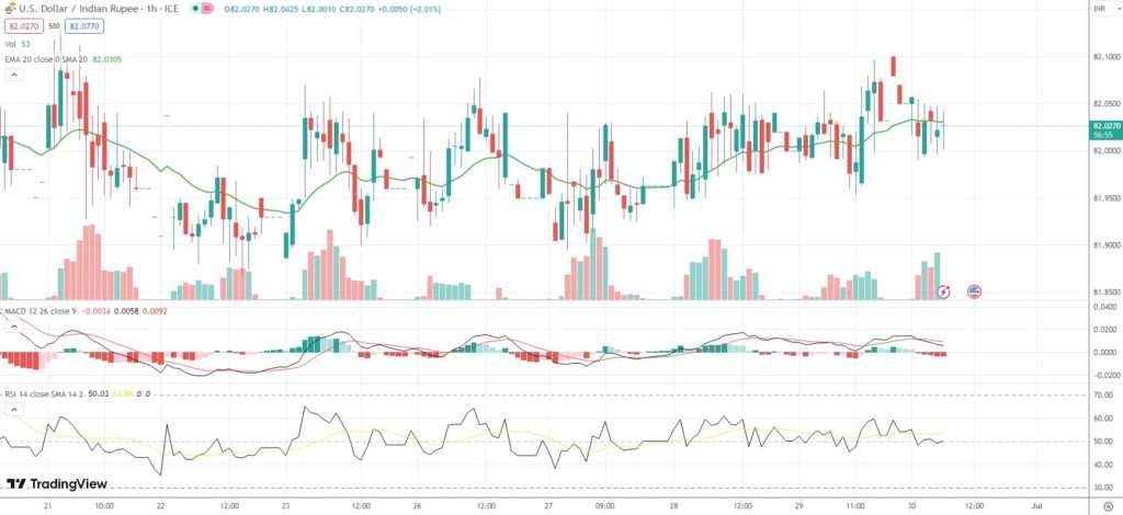 As of 7:02 GMT on Friday USD/INR was inching down 0.03% to trade at 82.0270. The exotic Forex pair has found solid support within the area between 81.8500 and 82.0000 over the past twelve trading days.