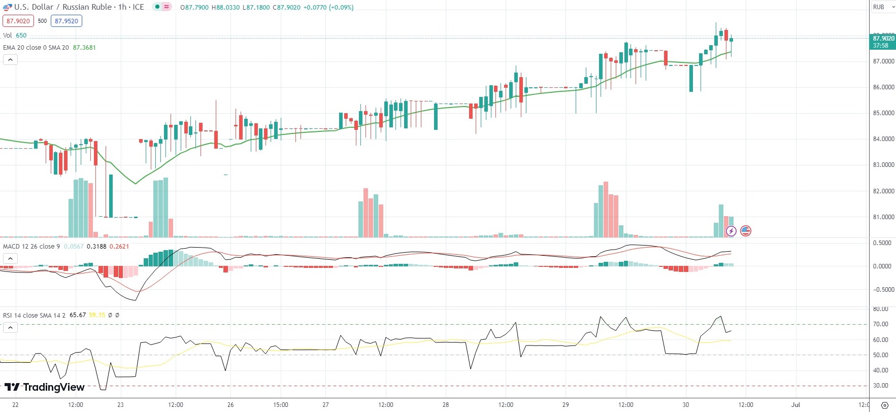 As of 9:21 GMT on Friday USD/RUB was gaining 1.22% to trade at 87.9200. During the late phase of the Asian trading session, the exotic Forex pair went up as high as 88.5055. The latter has been the pair’s strongest level since March 29th 2022 (95.7500).