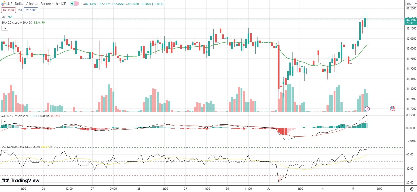 As of 7:39 GMT on Wednesday USD/INR was edging up 0.26% to trade at 82.1400. During the early phase of the European trading session, the exotic Forex pair went up as high as 82.1875. The latter has been the pair’s strongest level since June 15th (82.2525).