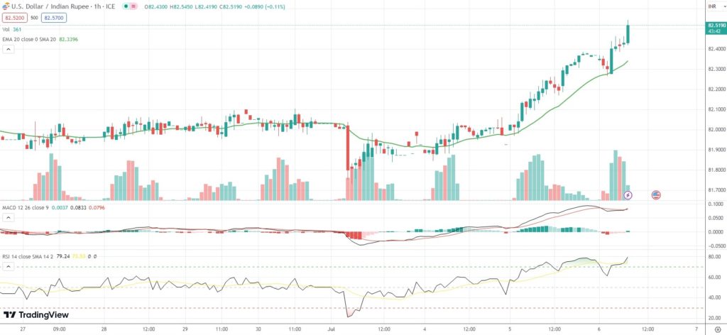 As of 7:15 GMT on Thursday USD/INR was edging up 0.19% to trade at 82.5250. During the early phase of the European trading session, the exotic Forex pair went up as high as 82.5450. The latter has been the pair’s strongest level since June 9th (82.5625).