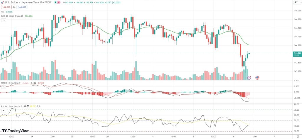 As of 9:21 GMT on Thursday USD/JPY was edging down 0.43% to trade at 144.031. During the early phase of the European trading session the major Forex pair went down as low as 143.553. The latter has been the pair’s weakest level since June 27th (143.281).