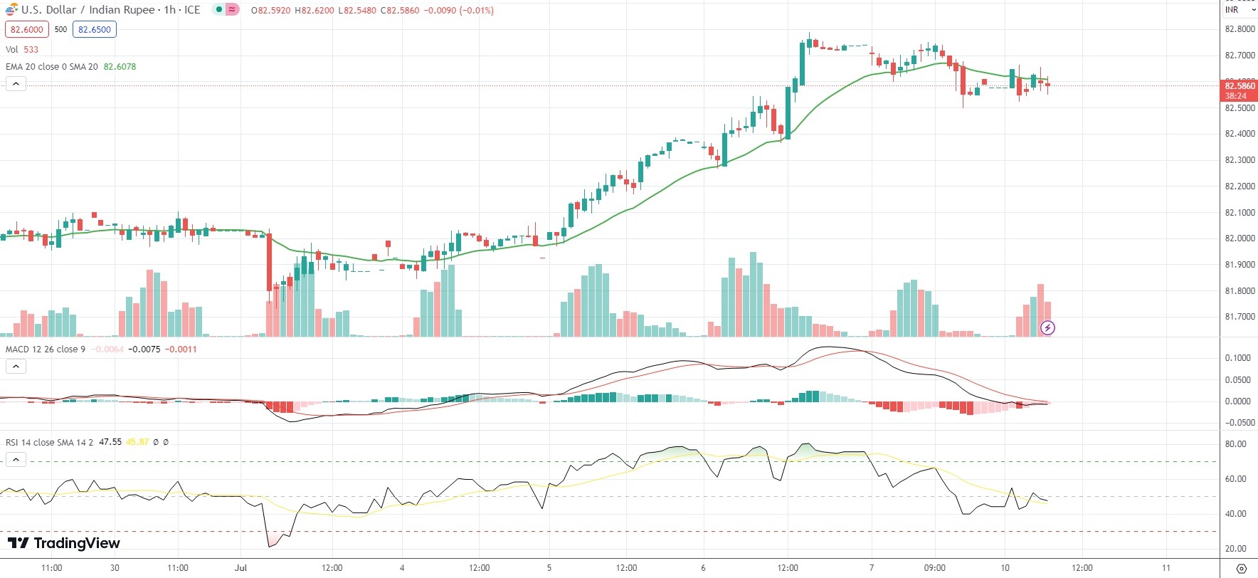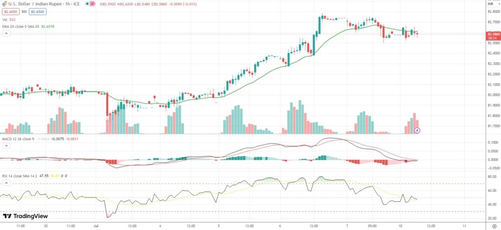 As of 7:20 GMT on Monday USD/INR was inching up 0.01% to trade at 82.5950. Last week, the exotic Forex pair went up as high as 82.7900. The latter has been the pair’s strongest level since May 24th (82.8610).