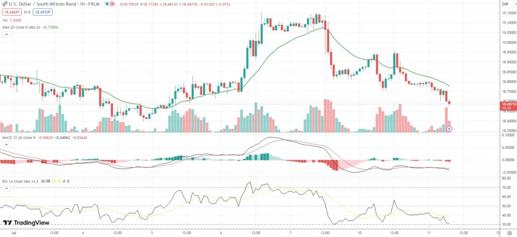 As of 7:24 GMT on Tuesday USD/ZAR was losing 0.51% to trade at 18.6914. Last Friday, the exotic Forex pair went up as high as 19.1523. The latter has been the pair’s strongest level since June 7th (19.3032).