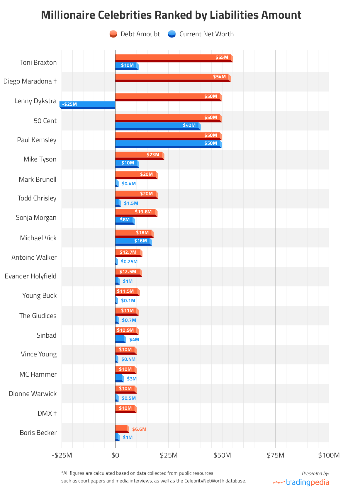 TradingPedia‘s study gives the answers and states the main causes of celebrities going into bankruptcy. All figures are calculated based on data collected from public resources such as court papers and media interviews, as well as the CelebrityNetWorth database.